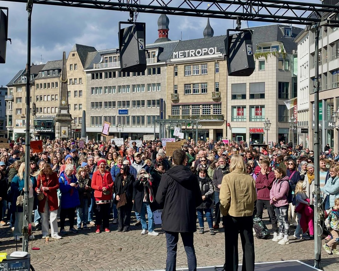 Rund 1.000 Menschen haben sich am Sonntagnachmittag auf dem Bonner Marktplatz versammelt. Sie sind laut, weil sie genug haben und ein Zeichen gegen sexualisierte Gewalt setzen wollen. Auslöser dafür ist die digitale sexuelle Gewalt, die die Schauspielerin Collien Fernandes seitens ihres Ex-Mannes erlebt haben soll.